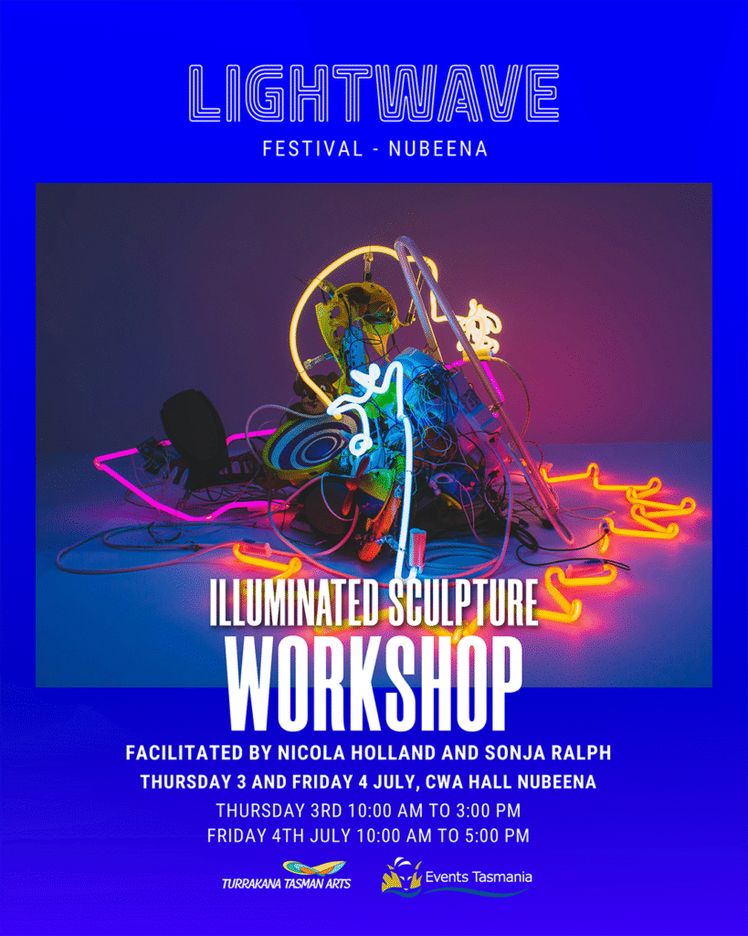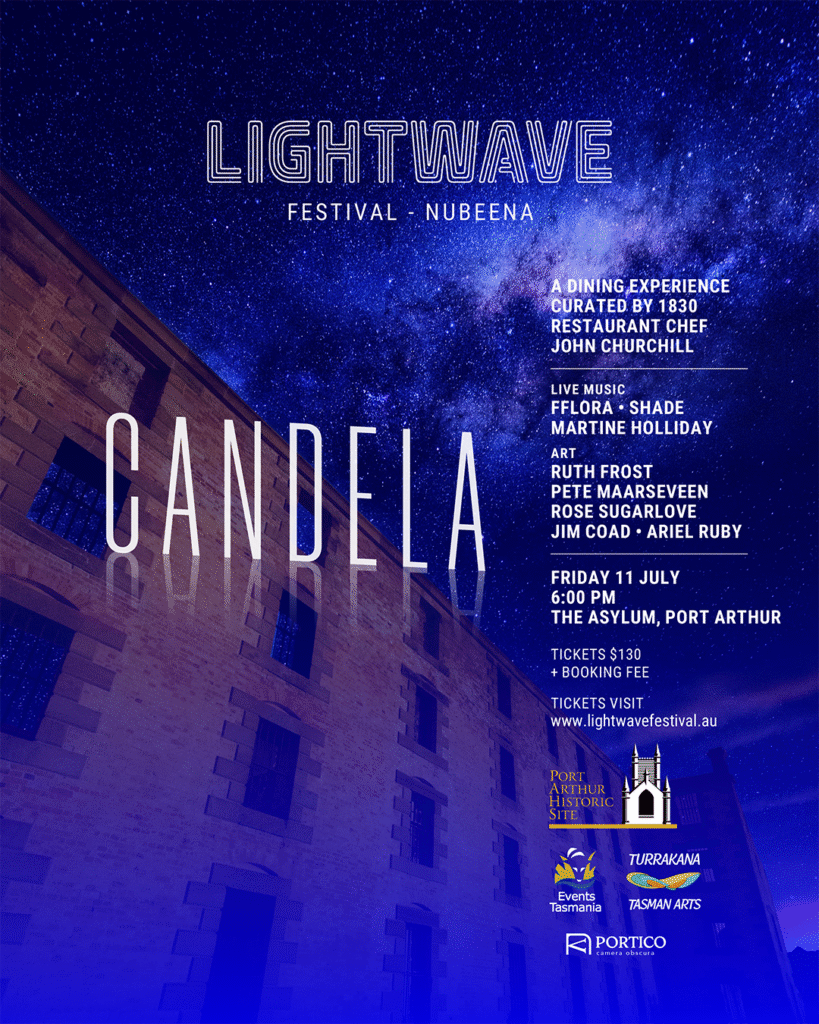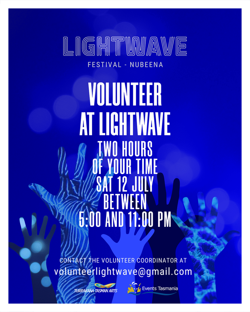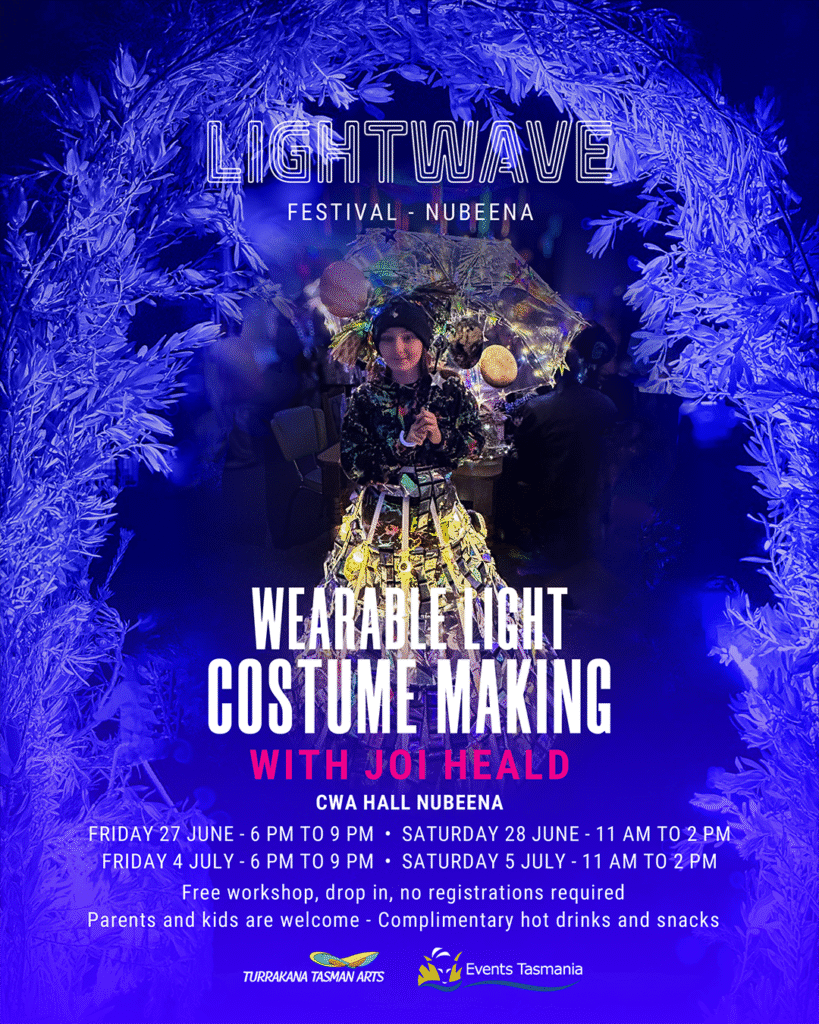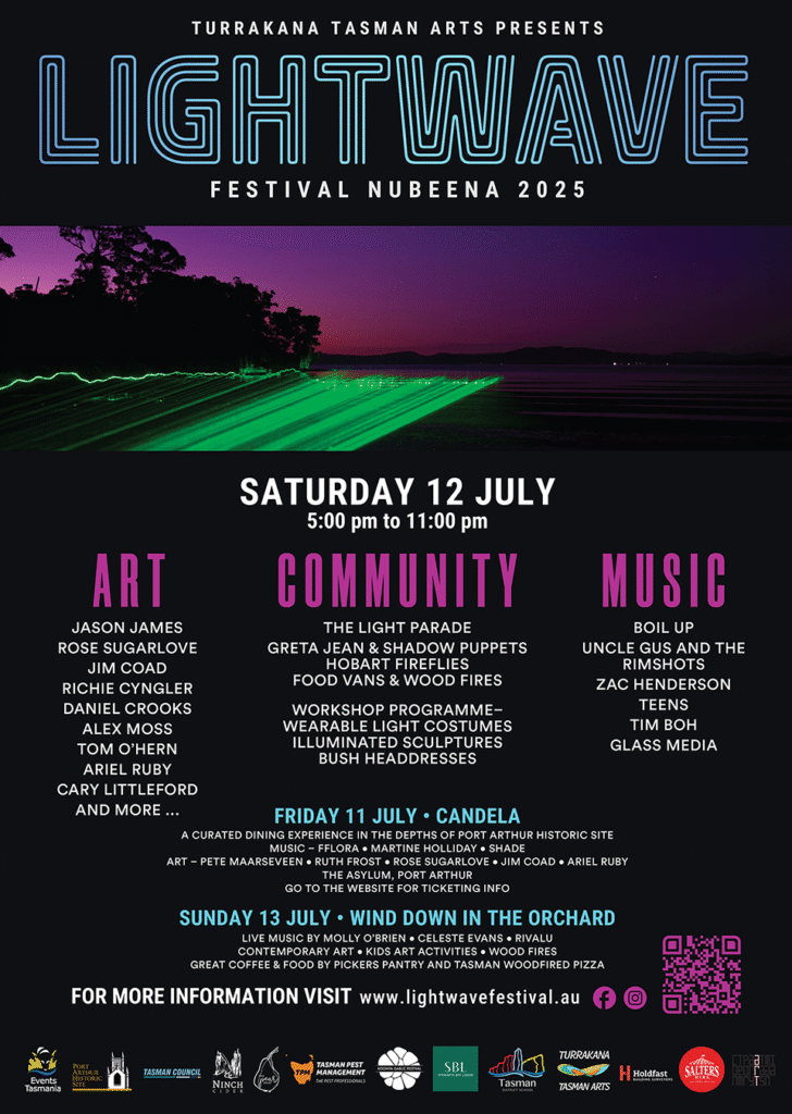 Lightwave is happening on July 11th, 12th, 13th in 2025 and is an annual winter arts festival celebrating ‘people and place’ across Turrakana Tasman Peninsula. Lightwave fosters community connection and collective warmth in the darkness of winter. Lightwave takes the phenomenon of light as a catalyst for the festival’s multi-artform programme.